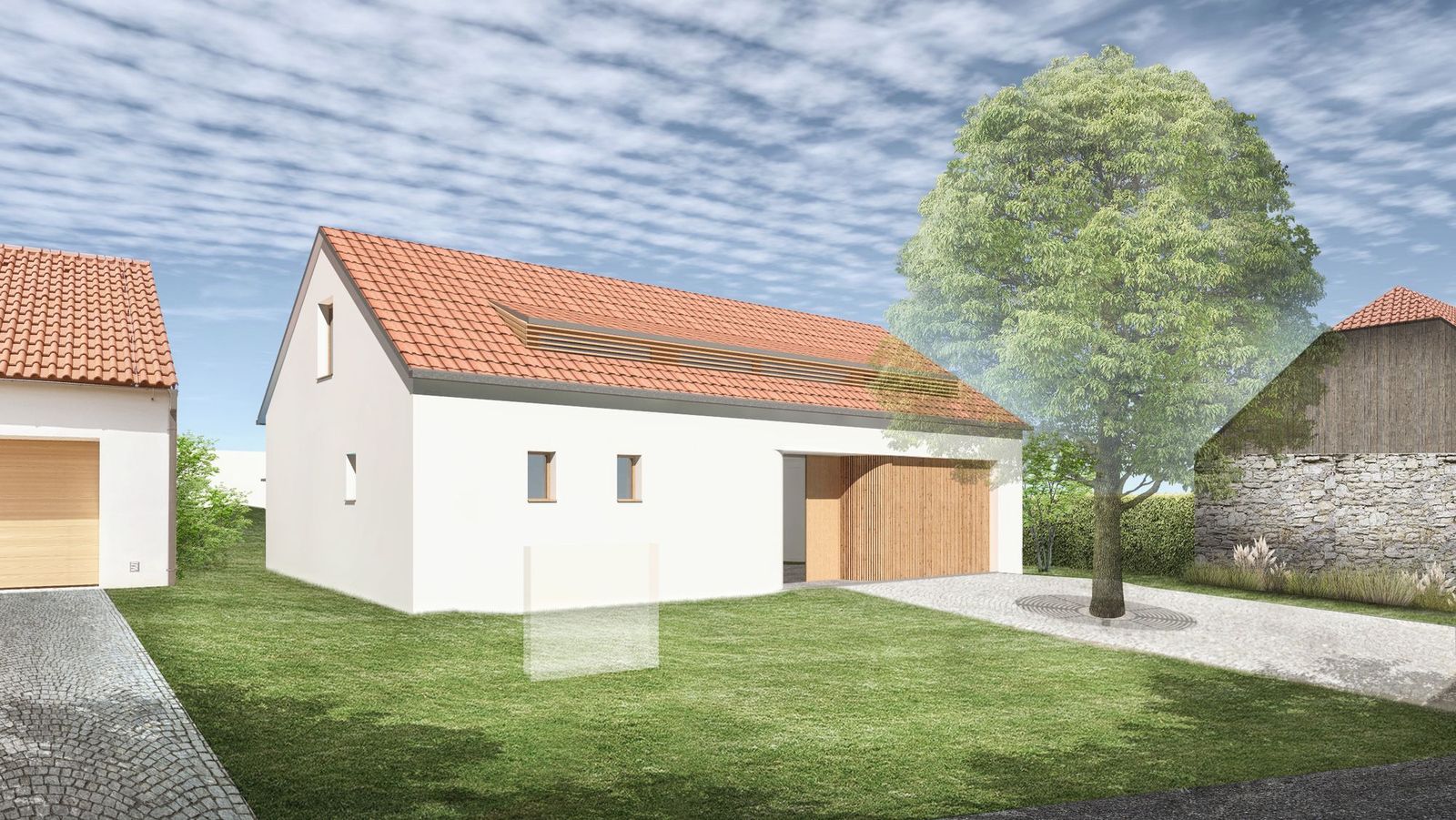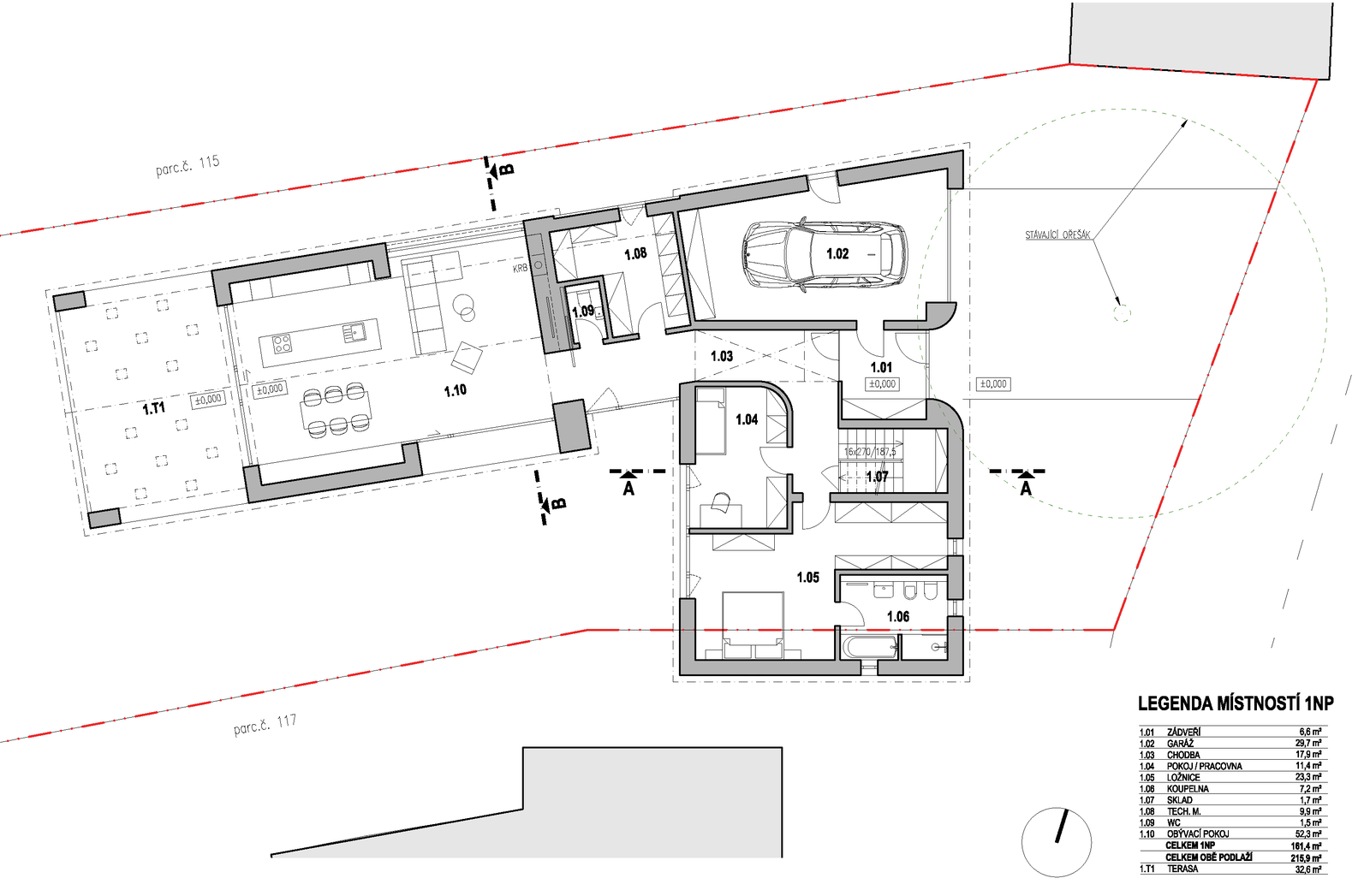 Důležitým momentem pro návrh bylo rozhodnutí o zachování vzrostlého ořešáku před domem.