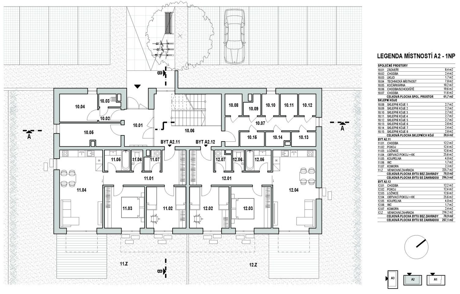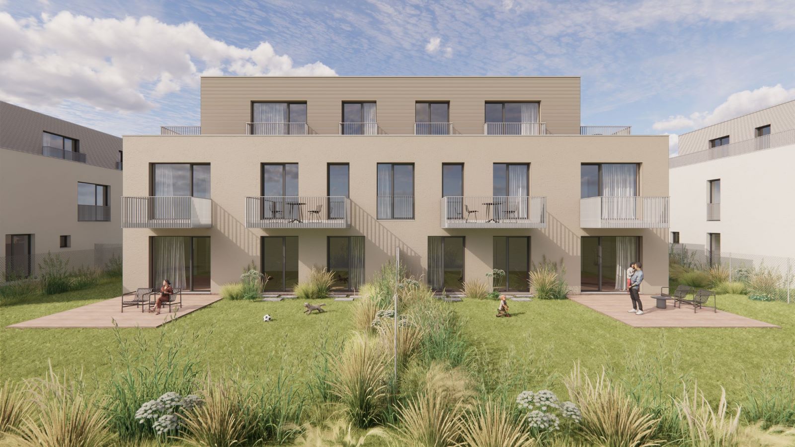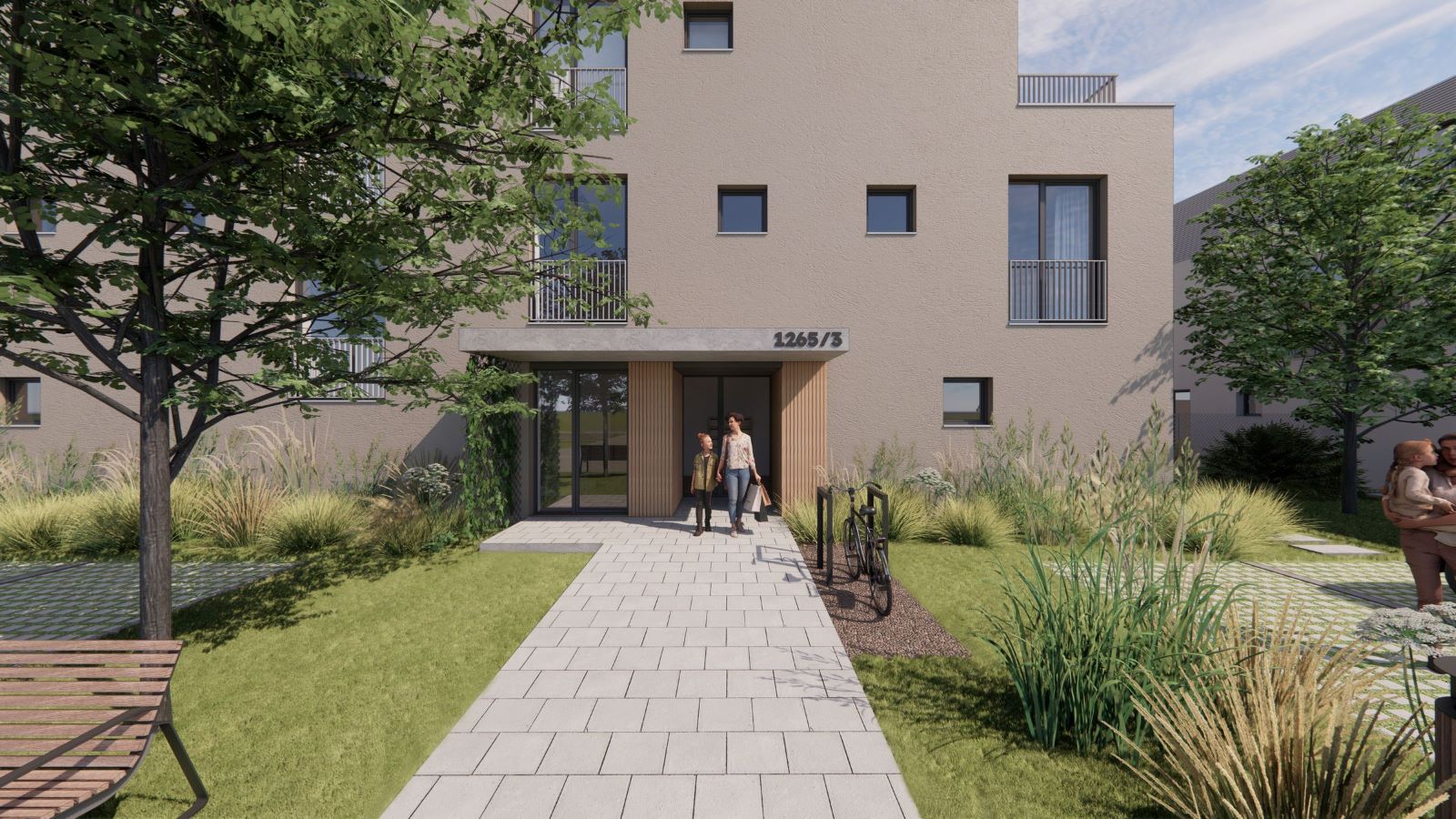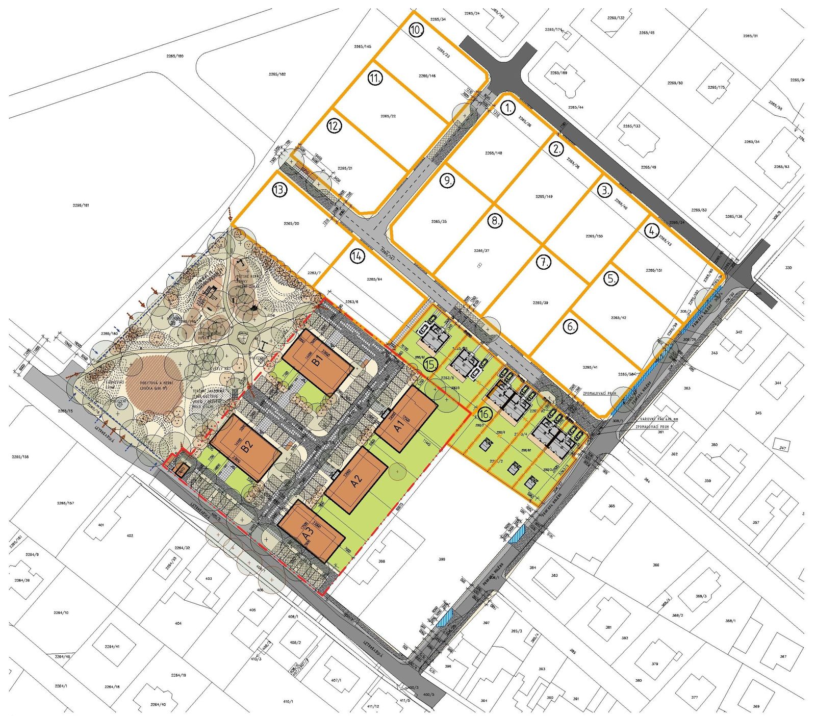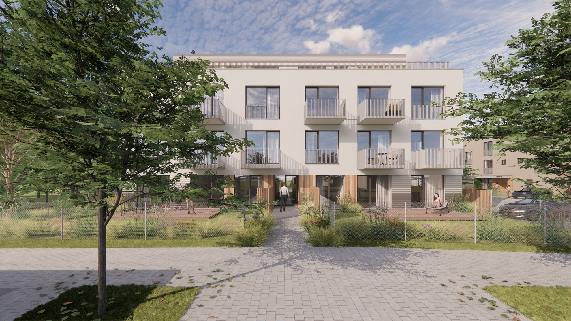 V rámci první etapy výstavby bytových domů jsme navrhli objekty A1, A2 a A3. Celá etapa obsahuje 24 bytových jednotek a 1 jednotku obchodní. V rámci druhé etapy jsou navrženy dva objekty B1 a B2 s celkovou kapacitou 24 bytových jednotek. Kapacity i hmotové řešení vycházejí z regulativů územního plánu a požadavků hlavního architekta města. Objekty se dvěma nadzemními podlažími a třetím ustupujícím chtějí co nejvíce svým měřítkem zapadnout do okolní zástavby převážně rodinných domů.