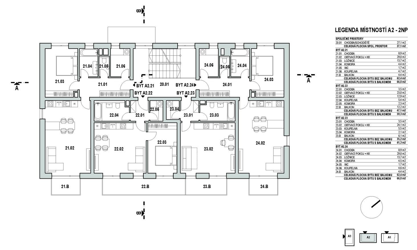 Velikosti bytů jsou od 1kk až po 4kk. Každý z bytů má k dispozici venkovní prostor, ať už formou předzahrádky, balkonu nebo terasy. U větších bytů, u kterých se předpokládá využití rodinami s dětmi, jsou navrženy předzahrádky. V druhém nadzemním podlaží jsou byty s prostornými balkony. Ve třetím nadzemním podlažím je pak díky uskočení hmoty dostatek prostoru na venkovní terasy.