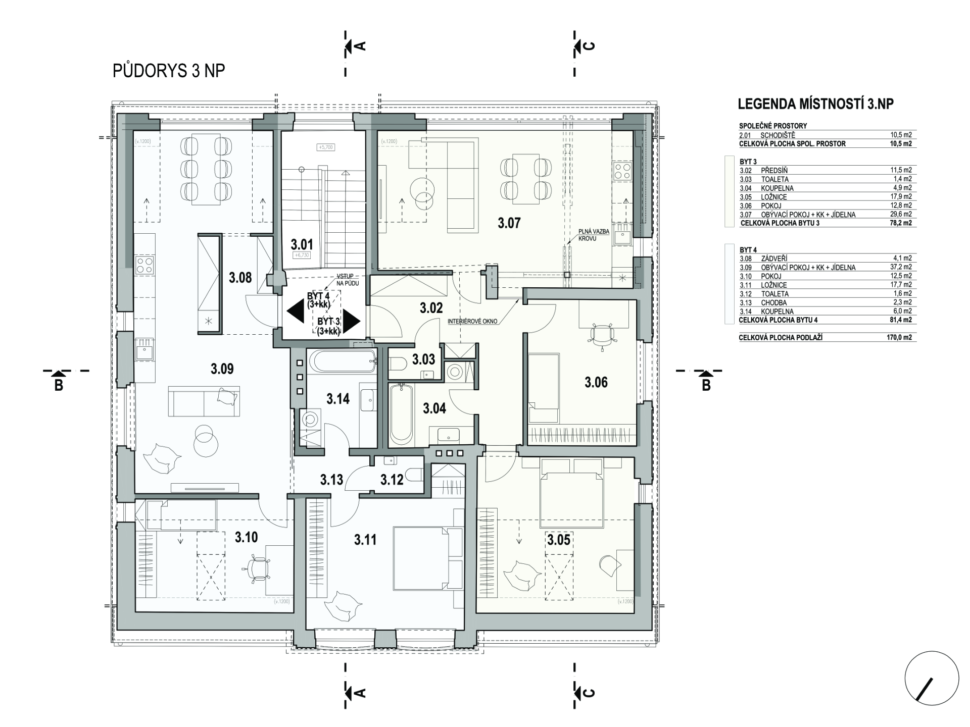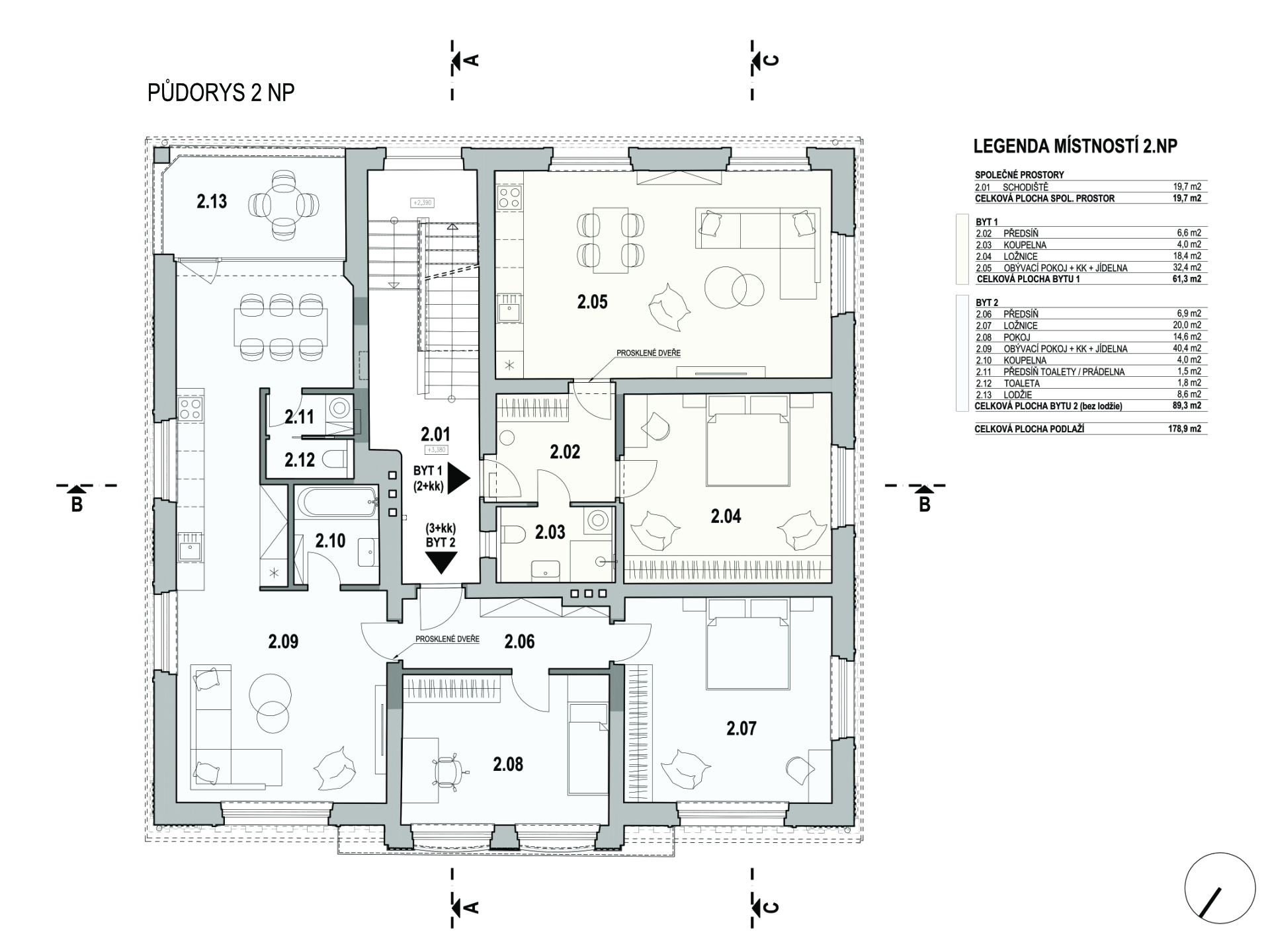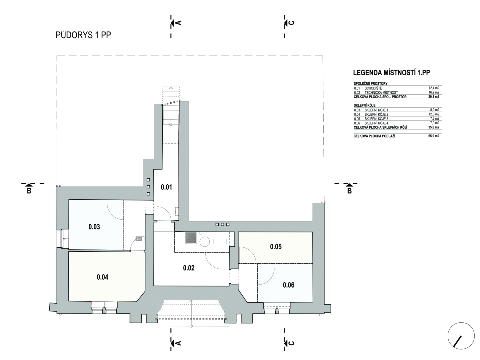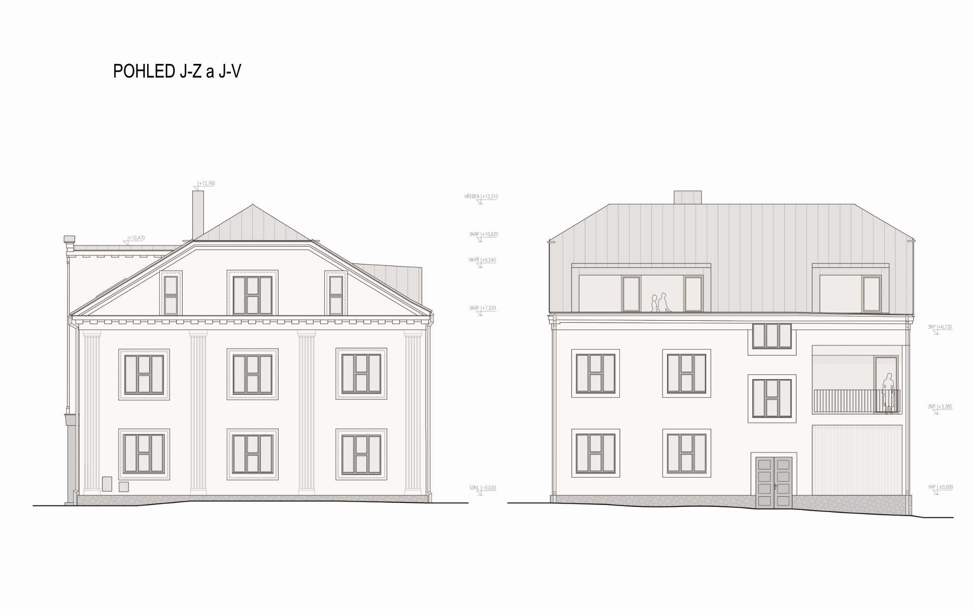Materiálově bude objekt řešen jednoduše a čistě - v kombinaci s bílou omítkou, šedou střechou, šedými a dřevěnými okny s původním kamenným soklem a schodištěm. Střecha je polovalbová, se stávajícím středovým vikýřem na uliční fasádě, který navazuje na vstupní portál. Pro nové byty v podkroví jsme doplnili na dvorní fasádě asymetrické vikýře jako novou architektonickou vrstvu doplňující původní vzhled.