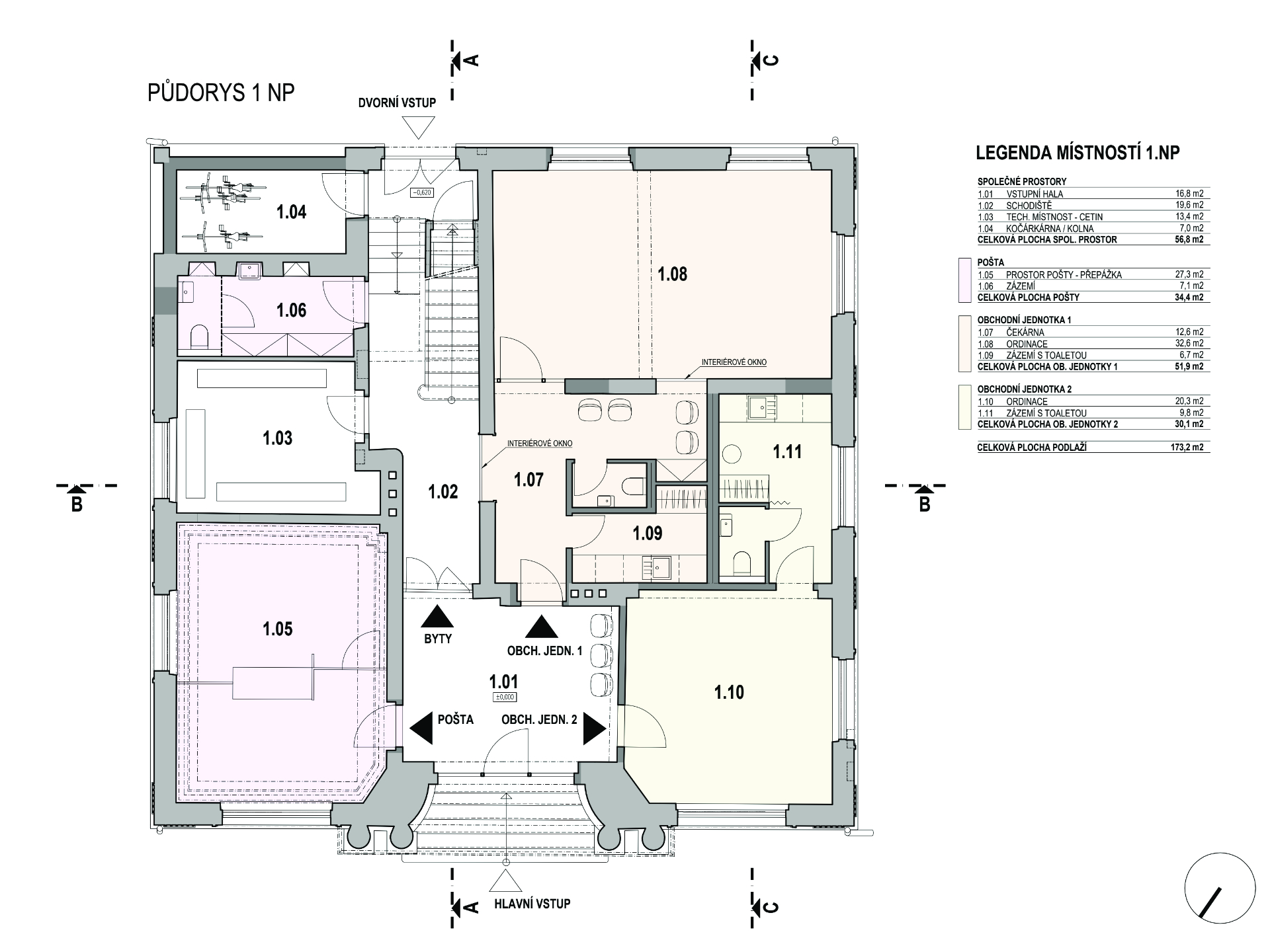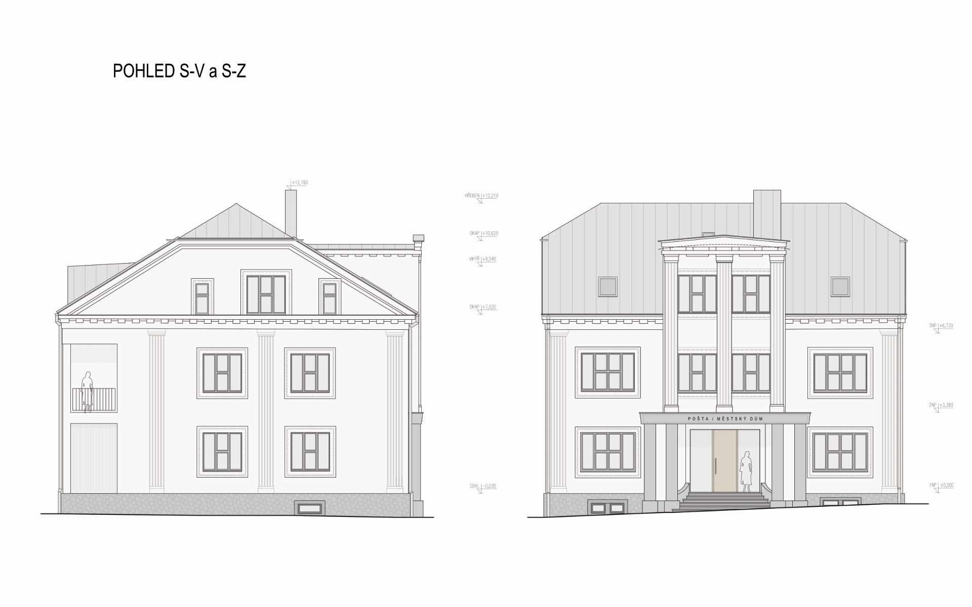 Původní stavba pošty ve Vacově je z roku 1931. Chtěli jsme zachovat v co největší míře původní historické vyznění fasády a interiéru, ale zároveň její využitelnost přizpůsobit dnešní době. Ve vstupním podlaží se nachází prostory pošty a pronajímatelných jednotek pro služby občanům Vacova. Ve vyšších podlažích pak byty.