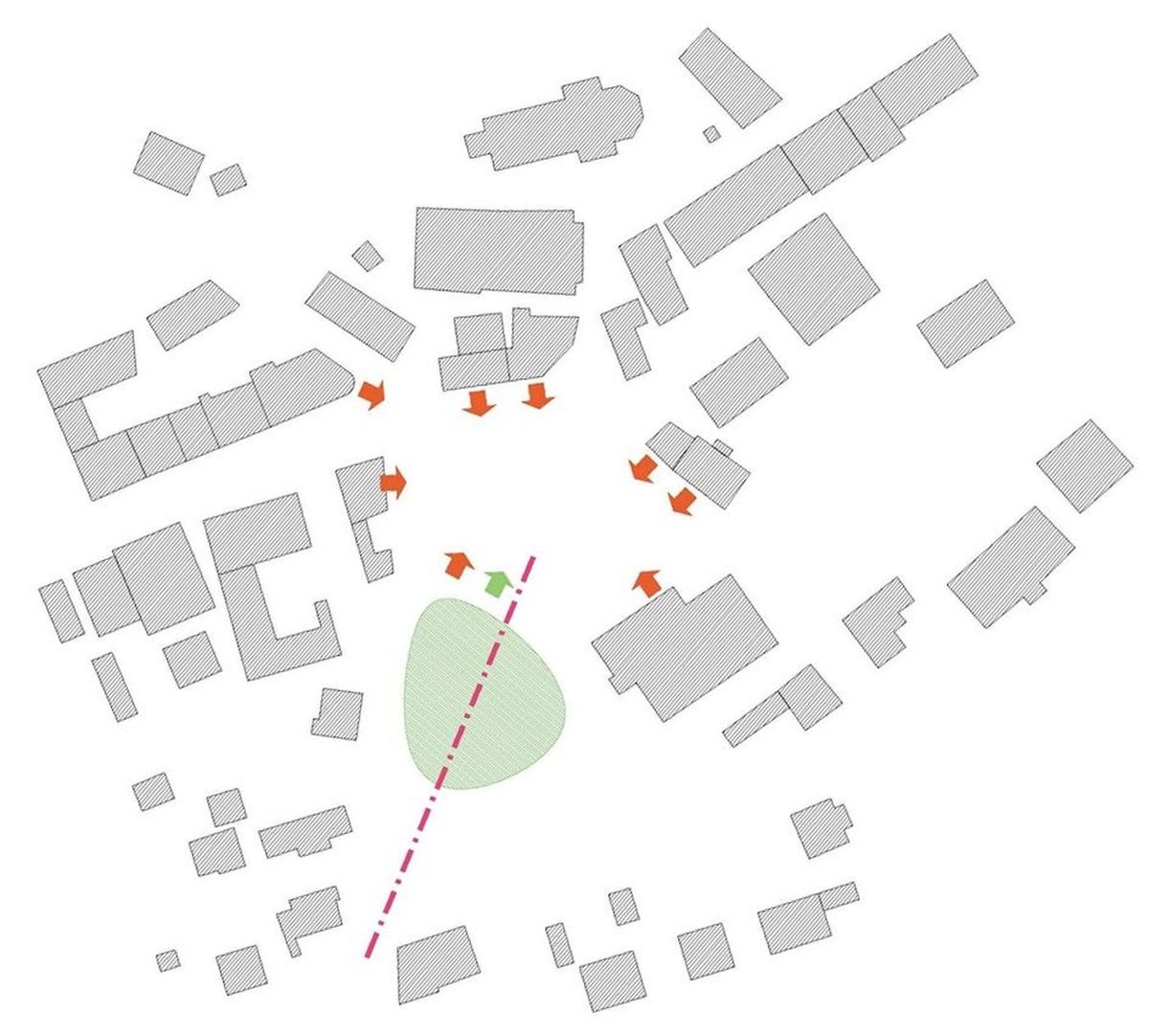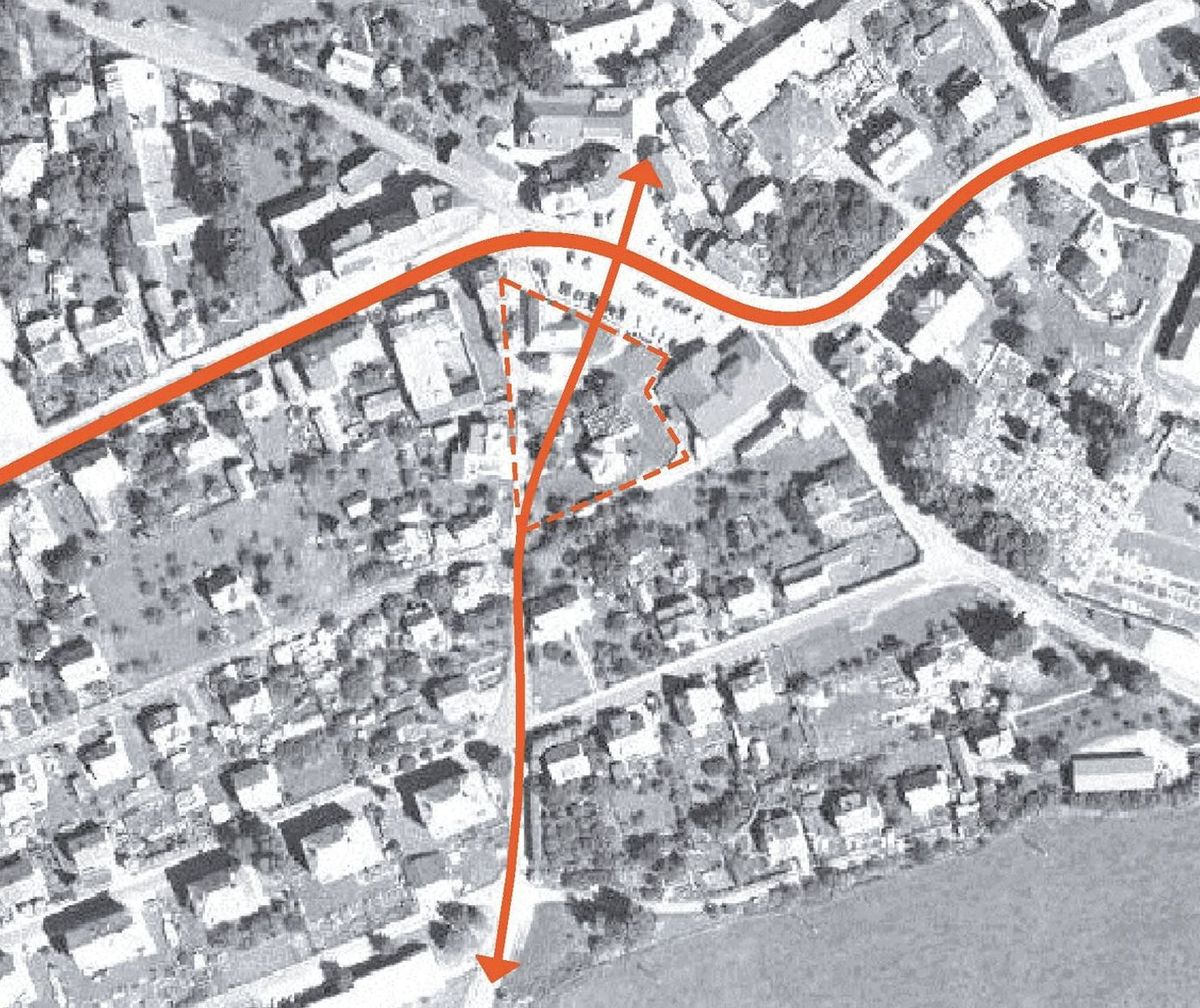 Severo-jižní osa, kterou návrh akcentuje, není v současném stavu zřetelná a je stávající urbanistickou kompozicí potlačena kamennou stěnou a objekty určenými k demolici. Tato osa tvoří velmi důležité propojení mezi historickou částí Vacova, které dominuje kostel a rozvojově novější částí Vlkonice, která zaznamenala největší vývoj v druhé polovině dvacátého století a bydlí zde také velké množství obyvatel.